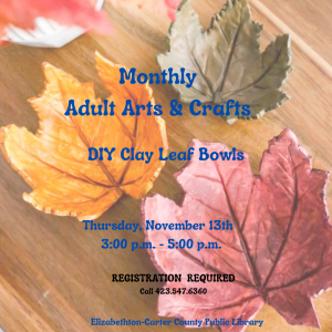 Join us for our monthly Arts & Crafts Thursday, Nov. 13th from 3-5 pm. This month we’re making clay leaf bowls, but to secure your spot call 423.547.6360 to register, or stop in and sign up. Locate and bring in an autumn leaf to use as your outline.