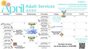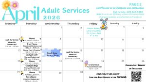 Aprils’ calendar is available in print at the circulation desk, spanning two pages. All events are additionally posted on our Facebook page and the Adult Services bulletin board located near the rear door. Should you have any questions regarding program schedule, please do not hesitate to call 423.547.6360.