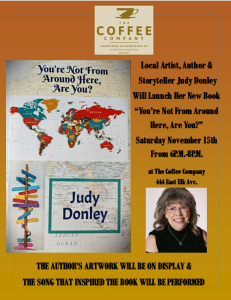 You are cordially invited to join us on Saturday, November 15th, as Judy Donley launches her book. The celebration will include an art exhibition, a story shared by the author, and a song performance that inspired the book’s title. Light food and various beverages will be served. We look forward to seeing you there as we celebrate this multifaceted artist, writer, and oral storyteller.