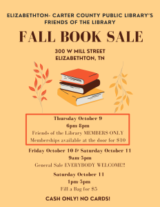 FOL General Book Sale Friday, October 10th & Saturday, October 11th from 9 p.m. – 5 p.m. Come out and support our library!