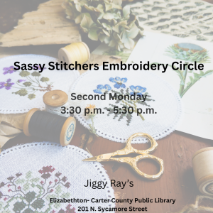 Join us for two hours of embroidery and other needle projects, plus camaraderie! Bring your projects and unleash your inner Sassy. Free event.